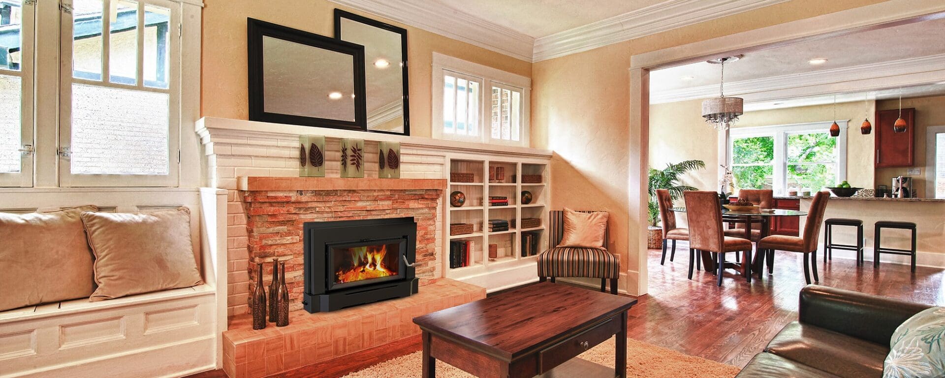 The Sirocco 25 is a medium sized fireplace insert. At 2.3 cu. ft., the firebox will take up to a 22″ log and can deliver warmth for up to 25 hours on low. The Sirocco 25 is very clean and efficient and can heat from 800 – 1,800 sq. ft. This flush insert extends to only 2.6 inches from the face of the fireplace to the door opening, helping to keep hearth protection to a minimum. The door features a large, 24″ x 11″, wide-screen glass viewing area with a nickel plated and hand made olive-wood door handle. Attention to detail is evident from the layered surround panel to the unique control system that allows you to select the heat you want.