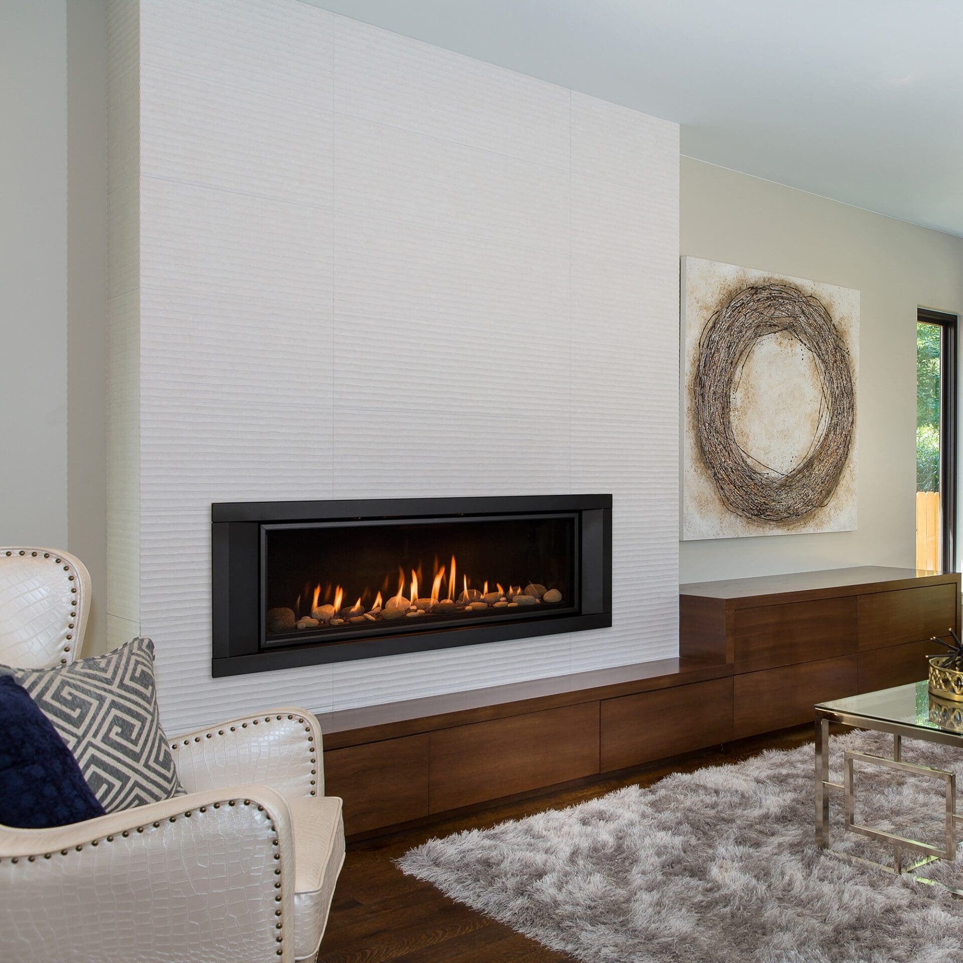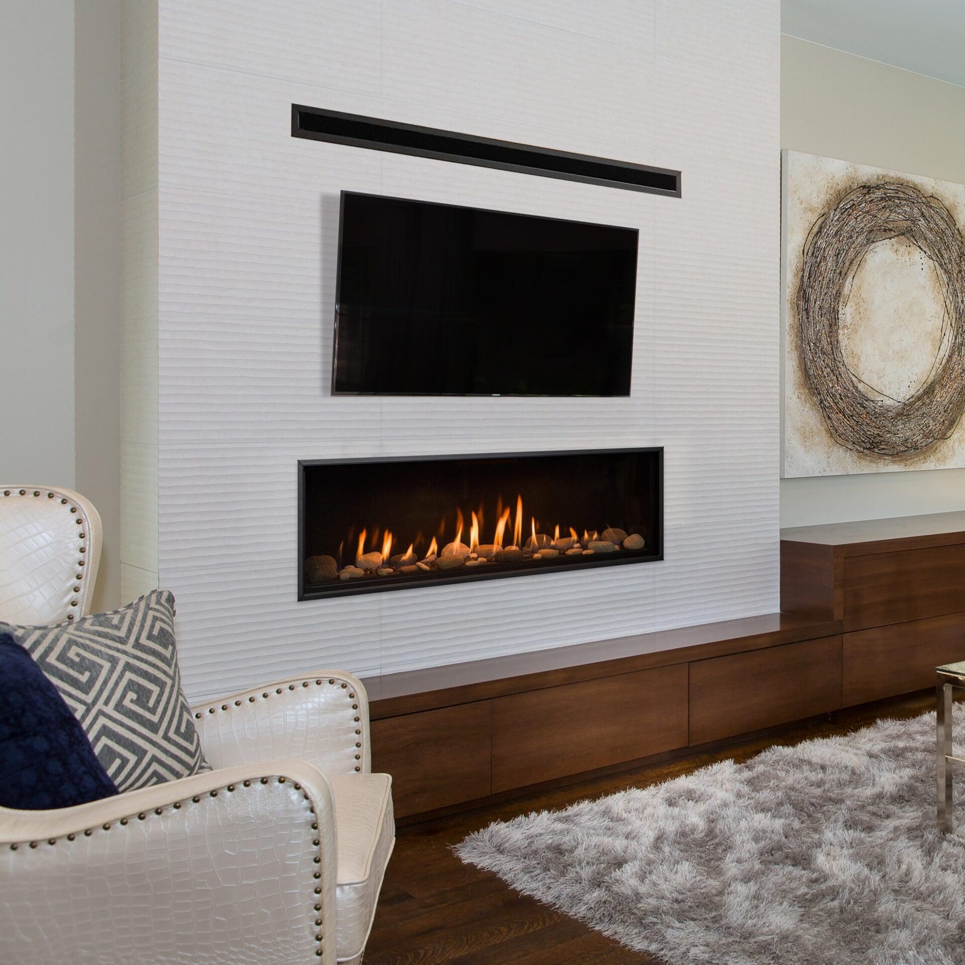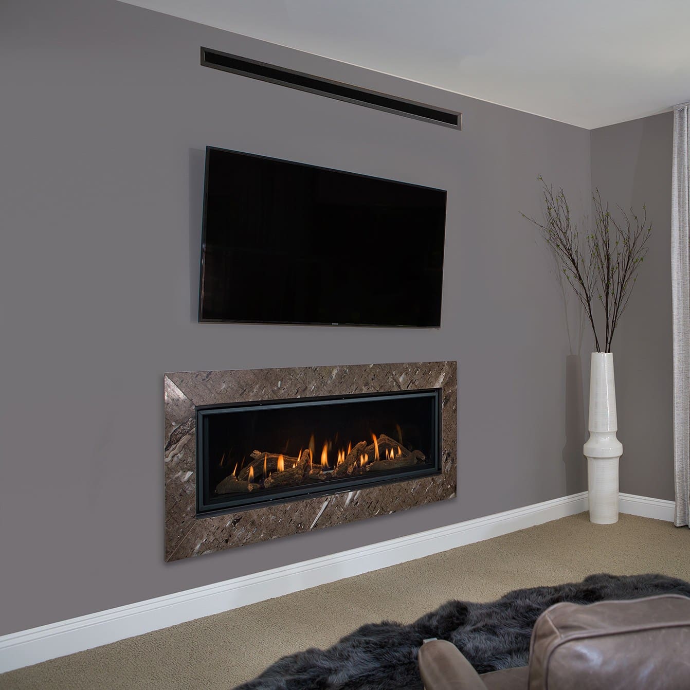 Linear Fireplace with many different styling options and comes with an optional Komfort Zone Kit. The Komfort Zone Kit gives you the ability to hang your TV safely above your fireplace and bring combustibles right up to the finishing edge.